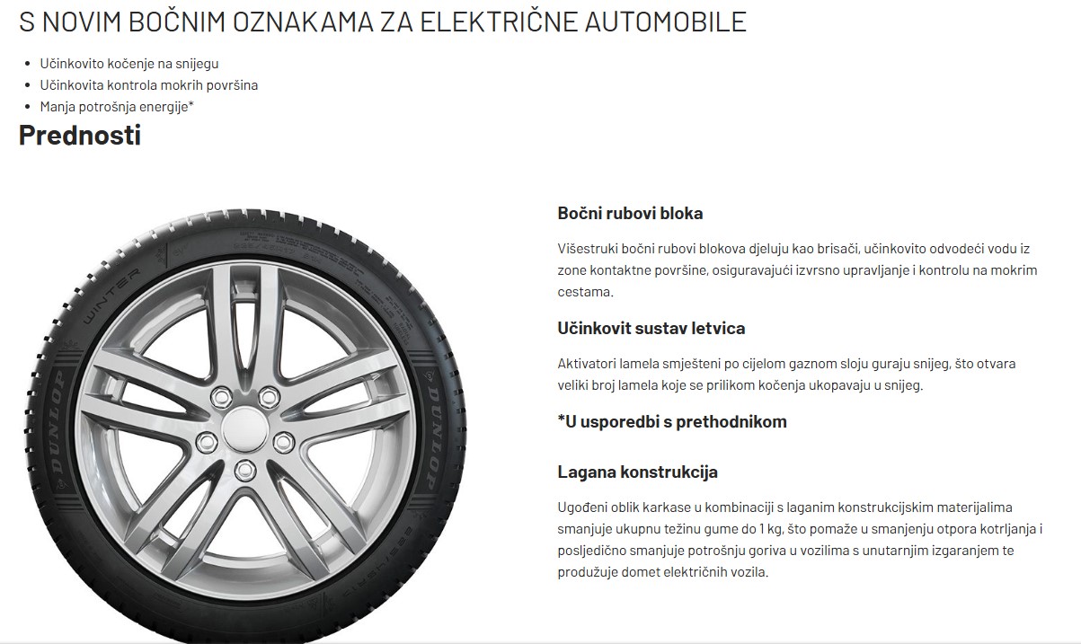 Dunlop Winter nudi Učinkovito kočenje na snijegu, učinkovito upravljanje na mokrom, niža potrošnja energije. Dunlop WINTERje novi model koji dodatno poboljšava performanse svog prethodnika u zadovoljavanju ovih potreba. Novi profil s inovativnom geometrijom bloka profila koji povećava vuču tijekom ubrzanja i kočenja na snježnim cestama.