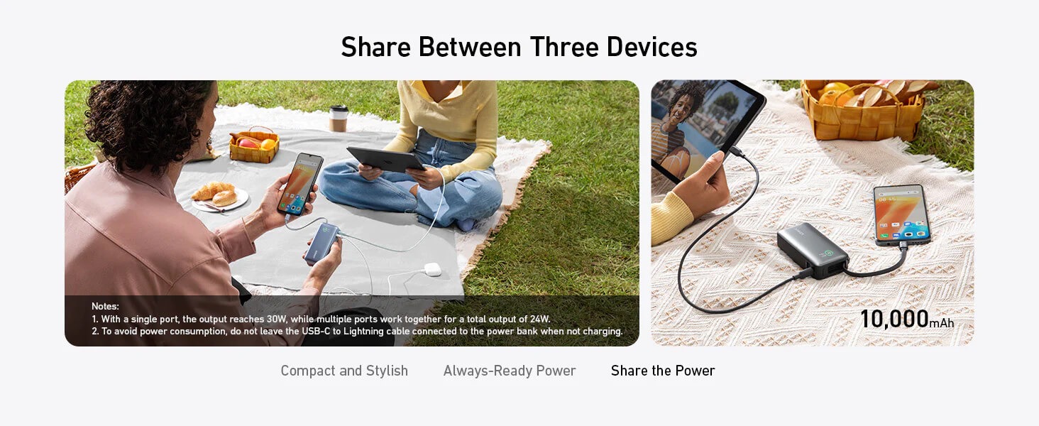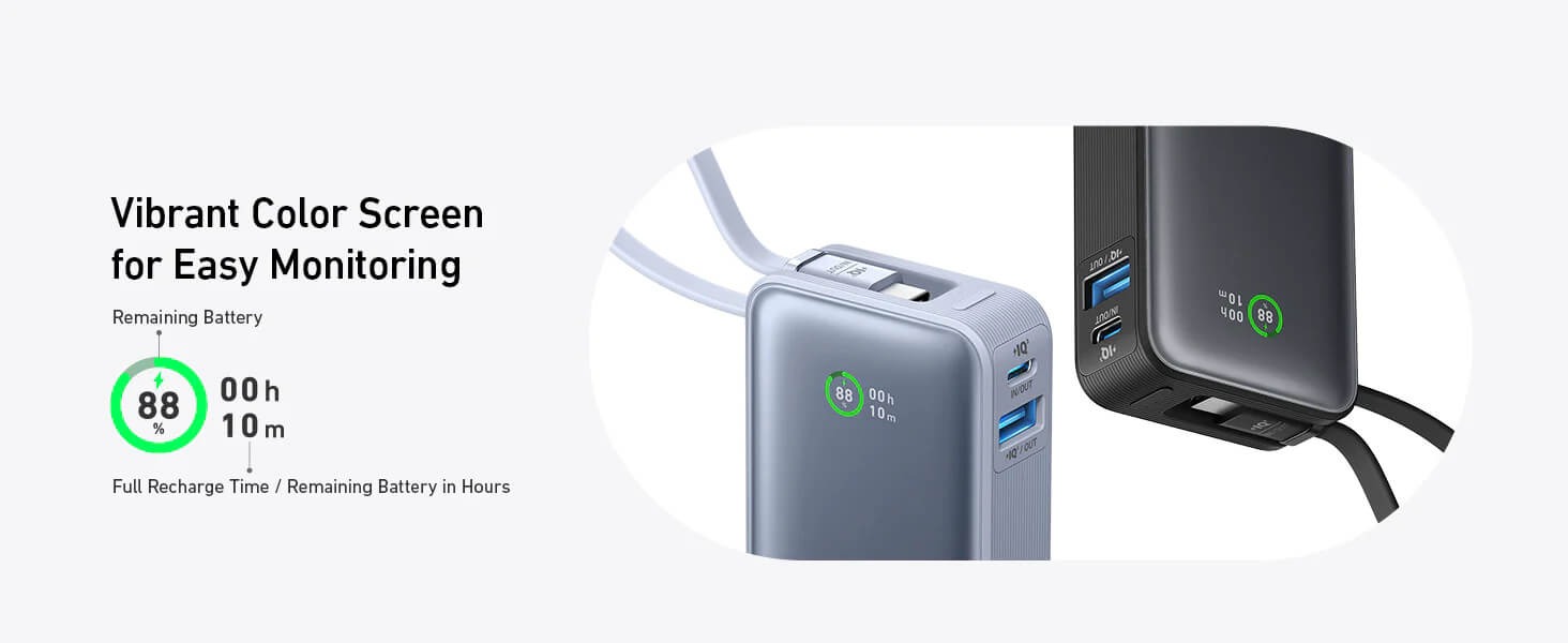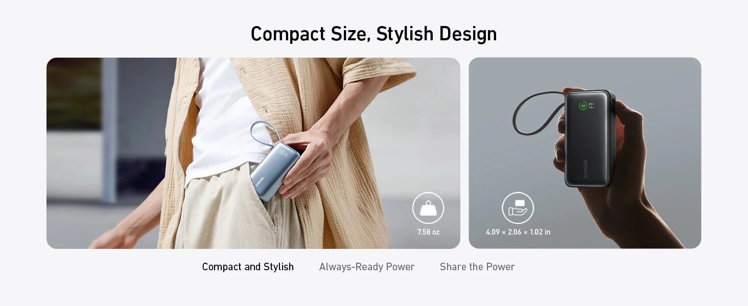 Doživite besprijekornu snagu u pokretu s ugrađenim USB-C kabelom koji osigurava besprijekorno punjenje u kompaktnom obliku koji mjeri 104 × 52,3 × 26 mm.