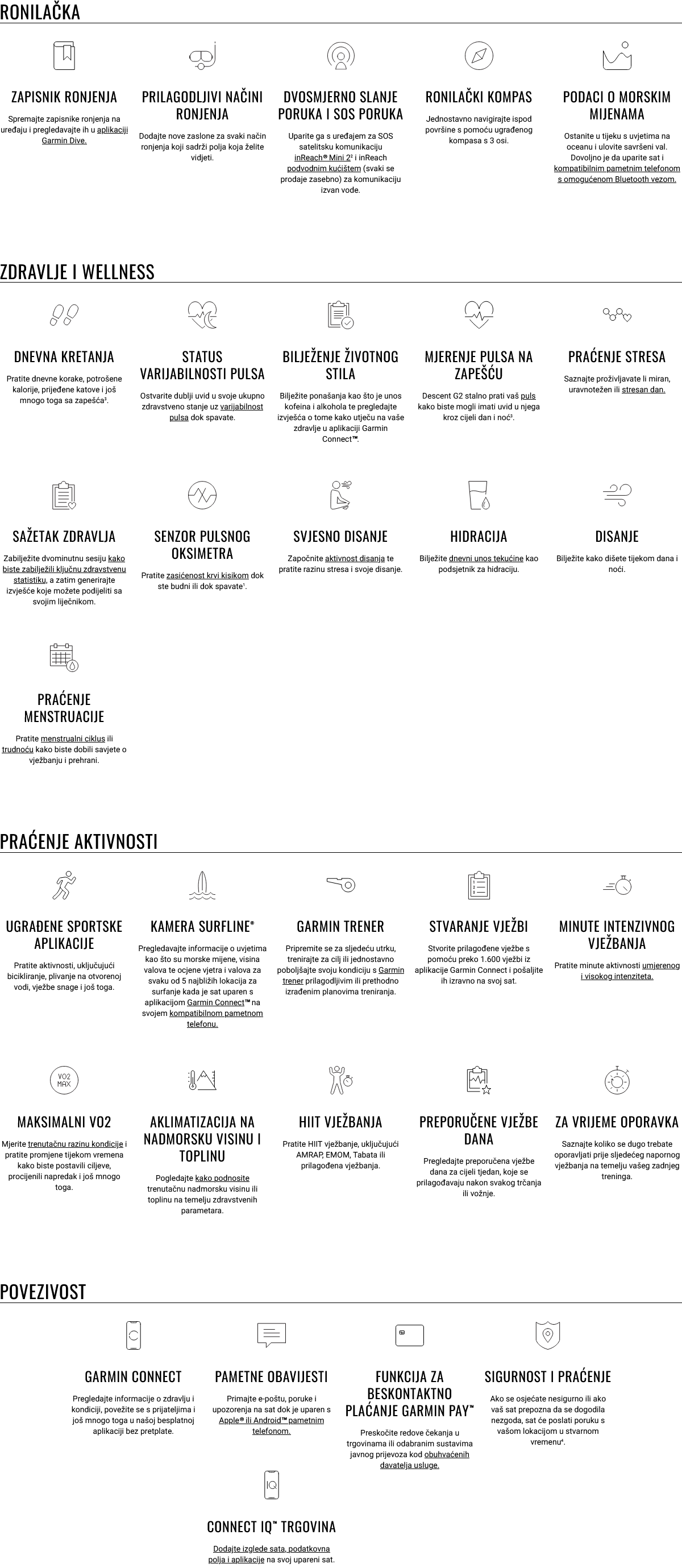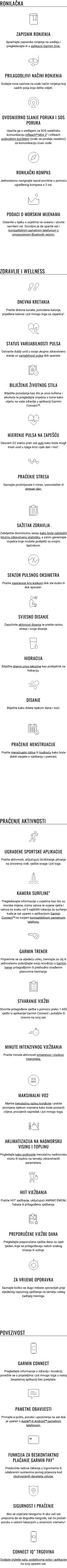 | Senzori | GPS, GLONASS, Galileo, Garmin Elevate™ monitor za mjerenje pulsa na zapešću, Pulsna oksimetrija, Barometarski visinomjer, Elektronički kompas, Žiroskop, Brzinomjer, Termometar, Senzor dubine |
