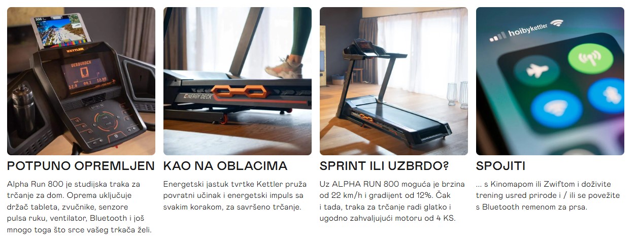 Kettler Alpha Run 800 traka za trčanje najsnažnija je među Kettler trakama za trčanje. Kettler Alpha Run 800 ima snažan 4,0 KM AC motor. Osim toga ima  široku i dugu površino za trčanje.