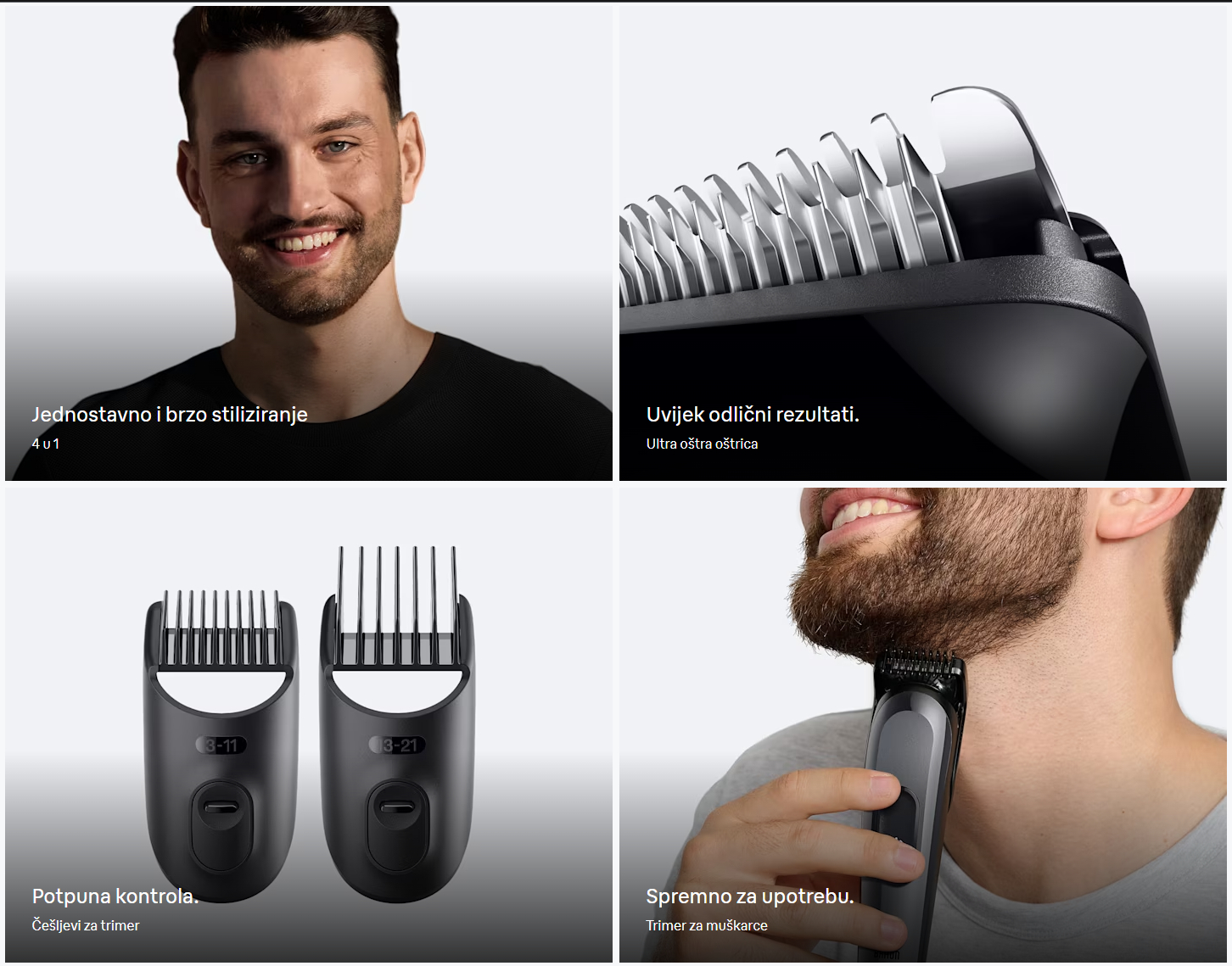 Braunov multifunkcionalni 4-u-1 komplet muškarcima omogućuje lako i jednostavno uređivanje dlačica na licu i frizure. Iznimno oštra oštrica osigurava brzo i učinkovito, ali i ugodno i precizno podrezivanje. Možete birati između 14 duljina pa je potpuna kontrola u vašim rukama. U kompletu dobivate perive glave i češljiće te četkicu za brzo i lako čišćenje uređaja. AIO3500 dolazi u sivoj boji, stvoren je da traje i ima bateriju koja omogućuje 50 minuta rada.