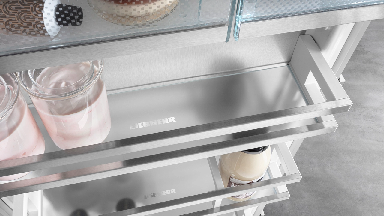 Pri svakom otvaranju uređaja Liebherr lice vam se ozari pri pogledu na satinirane ploče od sigurnosnog stakla ukrašene letvicama u boji nehrđajućeg čelika. Jednim se pokretom ruke bez problema mogu premještati po visini. Zahvaljujući satiniranoj površini, ogrebotine na staklenim pločama praktički su nevidljive, pa uređaj godinama zadržava luksuzan i privlačan izgled.