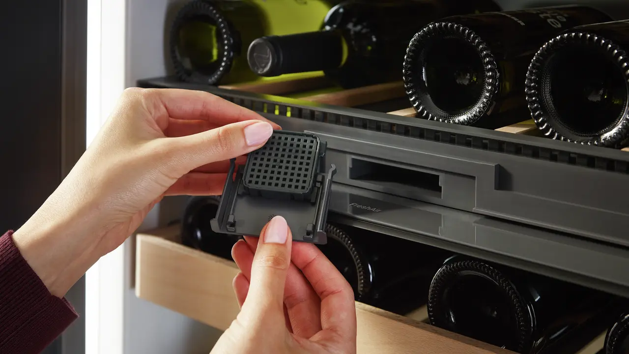 Da bi vino moglo dozrijevati pri optimalnoj kvaliteti zraka, sve odjeljak za temperiranje vina opremljen je filtrom s aktivnim ugljenom koji pouzdano veže sve vrste mirisa. Time se održava čisti bouquet vina. A da bi takav i ostao, Liebherr vas svakih šest mjeseci podsjeća da promijenite filter, što jednostavno možete učiniti sami.