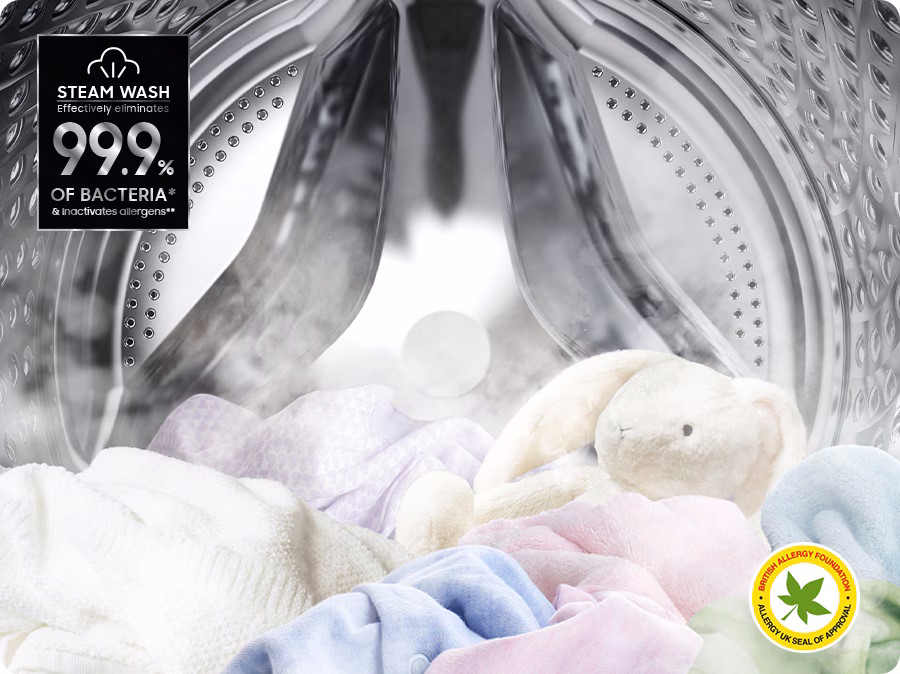 Pružite odjeći dubinsko i higijensko čišćenje. Higijenskim čišćenjem parom otpušta se para s dna bubnja. Uklanja prljavštinu i 99,9% određenih bakterija i neaktivnih alergena koje stvaraju grinje iz kućne prašine. Ciklus higijenskog čišćenja parom smanjuje izloženost alergenima iz kućnih grinja, psećih i mačjih dlaka, trava, peludi i gljivica.