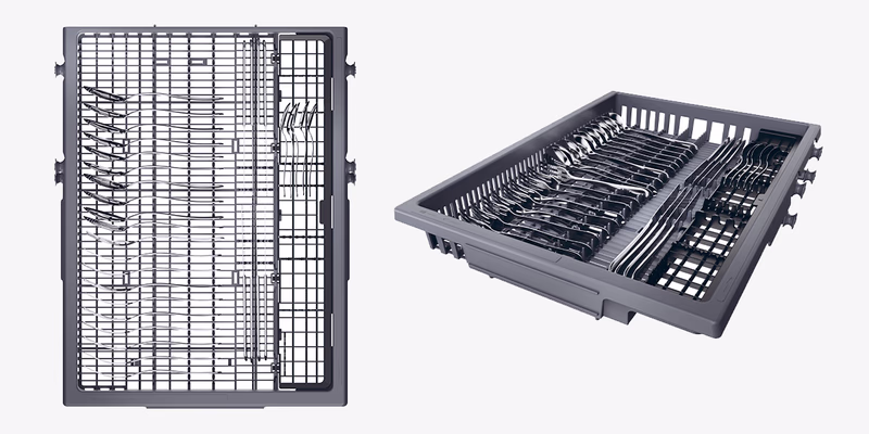 U novoj Candy Rapido' perilici posuđa, treća košara postavljena je cijelom dužinom s jasno označenim mjestima za slaganje velikog pribora, poput kuhača, za najbolje rezultate pranja.