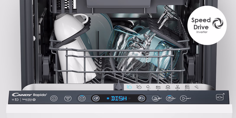 Iskusite Candy Rapido', revolucionarnu perilicu posuđa širine 45 cm s brzim programima i daljinskim upravljanjem preko hOn aplikacije - idealnu za suvremene kuhinje. Njen inovativni dizajn, brzi programi i povezanost olakšavaju vaš svakodnevni život, štedeći vrijeme i novac. Zahvaljujući Speed Drive Inverter Motoru, RapidÓ čisti i suši posuđe u samo 35 minuta. hOn aplikacija pruža savjete za optimizaciju korištenja perilice posuđa prema vašim potrebama. Candy Rapido' - jedinstveno iskustvo koje unapređuje vaš život, pružajući izuzetnu učinkovitost.