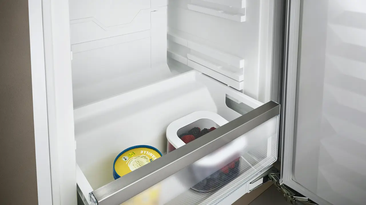 Iskusite praktičnost naših ugrađenih vodilica za ladice zamrzivača. Vodilice će se pobrinuti za to da ladice glatko klize, te spriječiti ogrebotine i pružiti dodatno usmjeravanje i sigurnost. Uz graničnik za izvlačenje ladice ostaju stabilne i neće pasti niti se nagnuti čak i pri kutu otvaranja vrata od 90°. Uživajte u neometanom pristupu zamrznutim namirnicama.