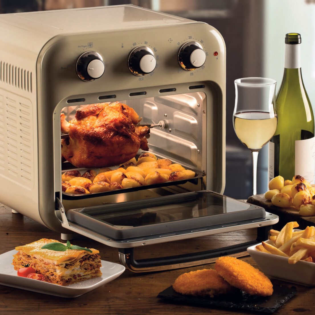 Zračna komora friteze na vrući zrak i pećnice Vintage obuhvaća hranu na 360° i priprema vaša omiljena jela, slatka i slana, bez dodane masnoće.