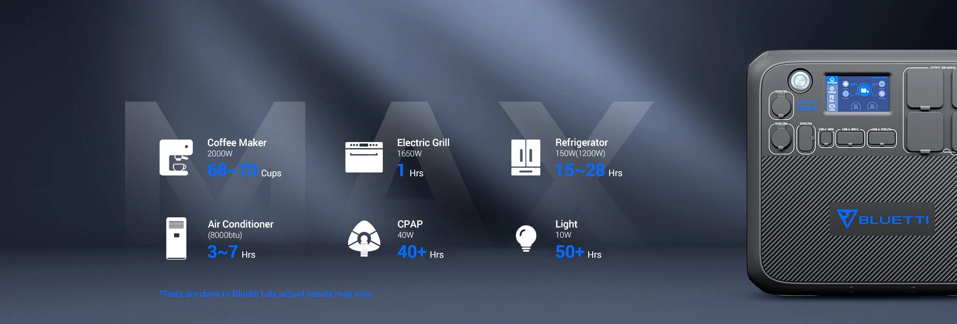 AC200MAX omogućuje do 900W solarnog ulaza i 500W putem adaptera, a možete ga čak puniti i putem zidne utičnice i solarnih panela istovremeno, čime se postiže impresivna ukupna brzina punjenja od 1400W koja može napuniti vaš AC200MAX u manje od dva sata! Svaki BLUETTI baterijski modul ima svoj vlastiti ulazni priključak za AC adaptere, što vam omogućuje dodatnih 500W ulazne snage s dodanim modulom (do dva za AC200MAX).