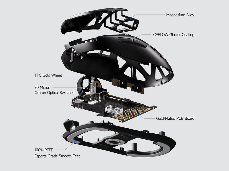 A7X Ultra izrađen je s velikim kućištem od magnezijeve legure i otvorenim donjim dizajnom, što mu daje iznimnu čvrstoću i rigidnost. Sa samo 53 g težine pruža izuzetno laganu kontrolu, precizno upravljanje i udobnost tijekom dugotrajnih gaming sesija.