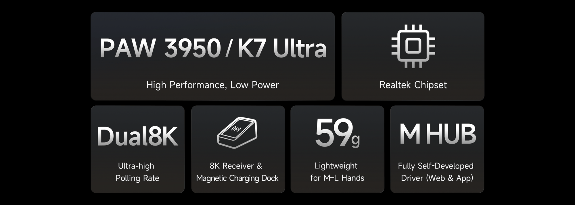 MCHOSE K7 Ultra je naš prvi tri-mode gaming miš opremljen magnetskim bežičnim punjačkim stalkom. Uz PAW3950 senzor, 8.000 Hz polling rate, proprietarnu bežičnu tehnologiju i ultra lagani dizajn, svaki je element konstruiran za natjecateljsku dominaciju.