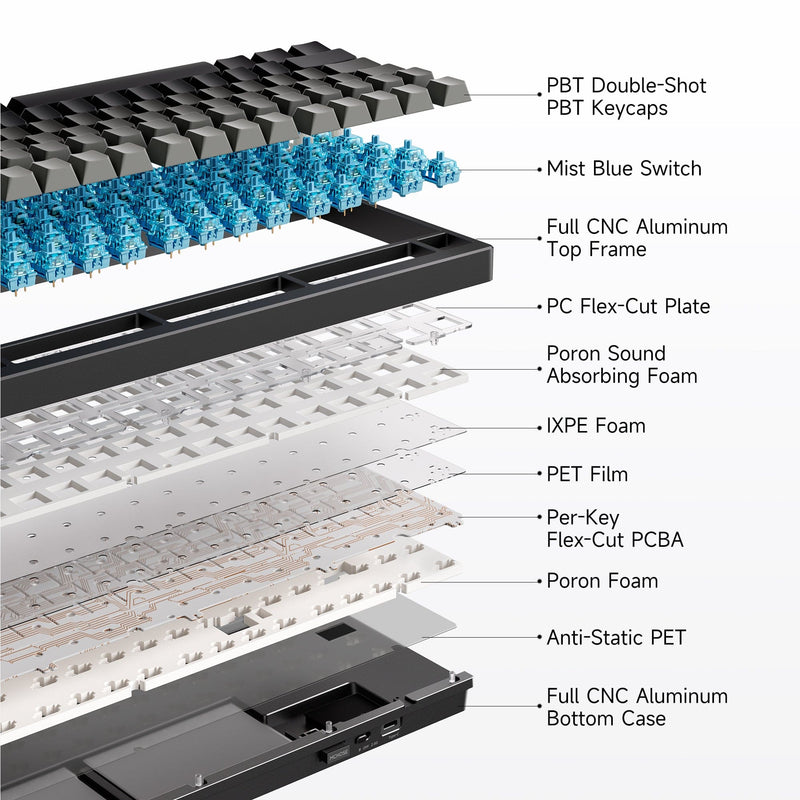 Tipkovnica nije samo alat — ona je iskustvo. Zahvaljujući gasket-mount konstrukciji i peteroslojnom sustavu za prigušivanje zvuka, GX87S pruža mekan, elastičan pritisak tipki i čist, jasan zvučni profil koji podsjeća na Hi-Fi audio sustave. Svaki pritisak tipke zvuči i osjeća se upravo kako treba.