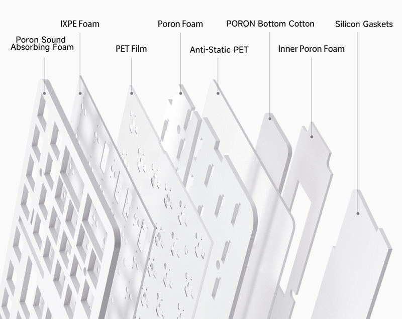 MCHOSE K99 koristi mekano-elastičnu gasket strukturu dizajniranu za veću udobnost pri tipkanju i bolju fleksibilnost. Njezin šest slojeva zvučno izolirajućih materijala — uključujući Poron pjenu, IXPE pjenu, PET film i silikonske slojeve — osiguravaju tiho, prigušeno iskustvo tipkanja s dubokim i ugodnim „thock“ zvukom pri svakom pritisku tipke.
