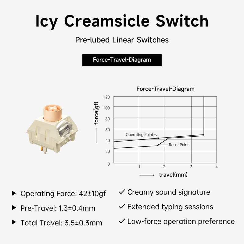 Doživi lagan i svilenkasto gladak osjećaj tipkanja s ugodno tihim „thock” zvukom. Ovi prekidači, dizajnirani za udobnost i performanse, koriste BOX konstrukciju s difuzorom svjetla, pozlaćenom oprugom i pre-press mehanizmom za savršeno glatko aktiviranje. Otporni su na prašinu i vlagu, što ih čini idealnim za duge tipkarske sesije i korisnike koji preferiraju lagan pritisak.