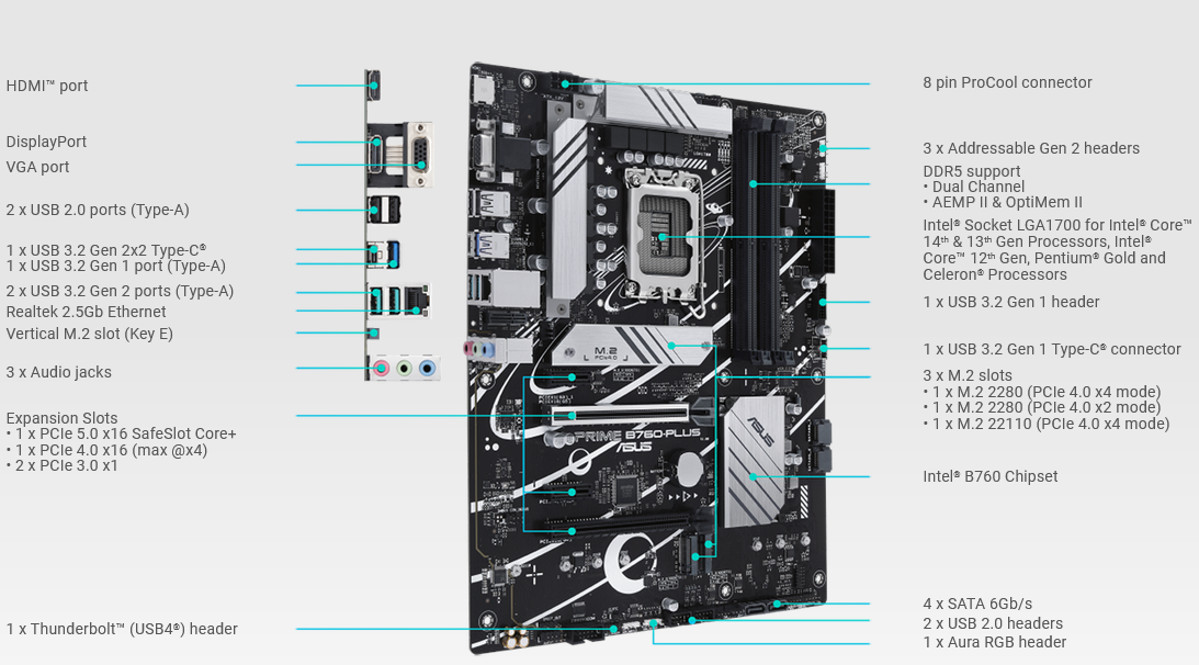 Matične ploče serije ASUS Prime stručno su projektirane kako bi oslobodile puni potencijal 14. generacije Intel ® Core™ procesora. S robusnim dizajnom napajanja, sveobuhvatnim rješenjima za hlađenje i inteligentnim opcijama podešavanja, PRIME B760-PLUS pruža korisnicima i samostalnim sastavljačima računala niz optimizacija performansi putem intuitivnih softverskih i firmverskih značajki.