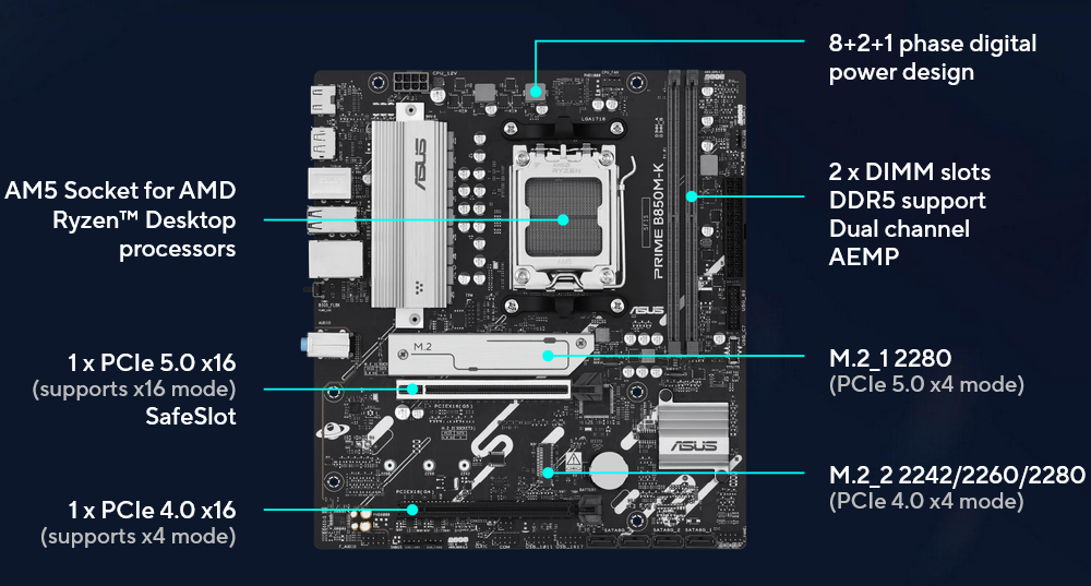 Matične ploče ASUS Prime serije stručno su konstruirane kako bi oslobodile puni potencijal AMD Ryzen ™ 9000 procesora. Matična ploča PRIME B850M-K pruža korisnicima i DIY sastavljačima računala niz optimizacija performansi putem intuitivnih softverskih i firmverskih značajki. Dizajnirana je da bude spremna za napredna AI računala, nudeći snagu i povezivost potrebnu za zahtjevne AI aplikacije.