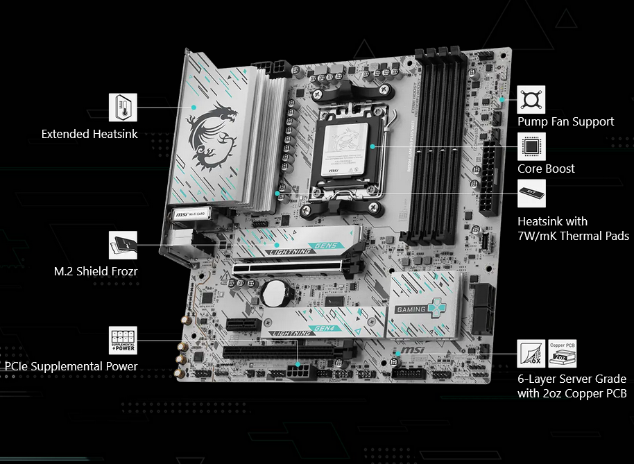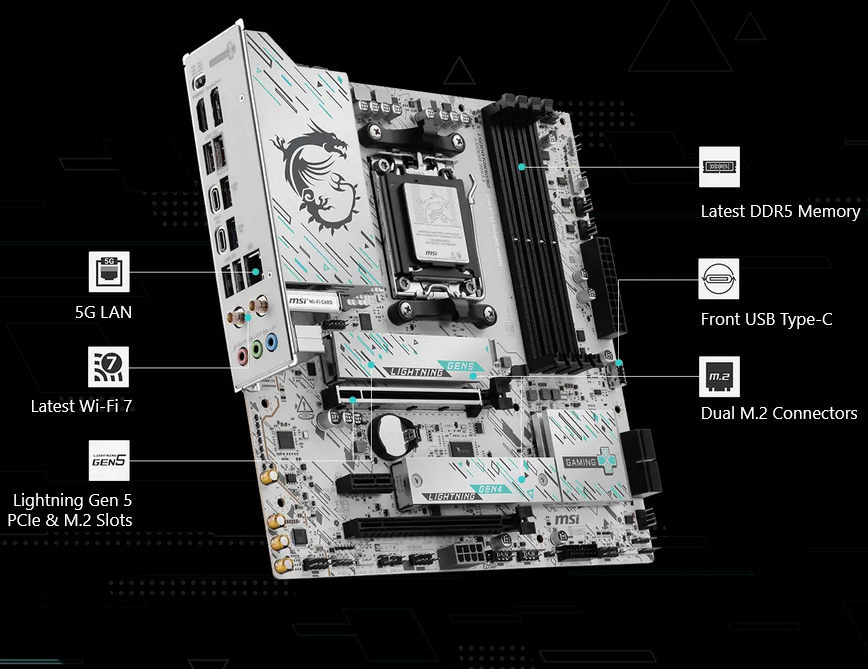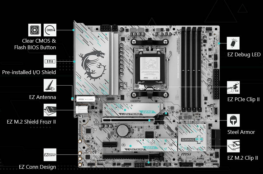 B850M GAMING PLUS WIFI izrađena je kako bi ponudila opsežnu povezivost, svestrane alate i vrhunsko Wi-Fi rješenje za igrače koji traže sveobuhvatno iskustvo. Uz najnoviji Wi-Fi 7, 5G LAN, PCIe 5.0 rješenje, dodatno PCIe napajanje i ekskluzivne EZ DIY značajke, spremna je za neprekidno igranje 24/7 optimizirano za AMD Ryzen™ 9000 seriju procesora.