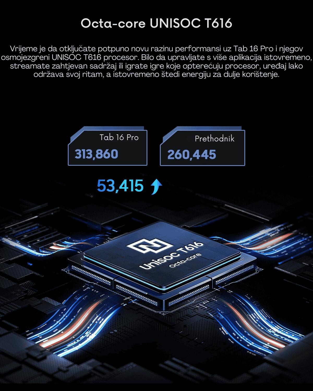 Blackview Tab 16 Pro pokreće snažni osmojezgreni UNISOC T616 procesor, osmišljen za fluidan rad i besprijekornu multitasking izvedbu. Bilo da upravljate više aplikacija, igrate zahtjevne igre ili streamate visokokvalitetni sadržaj, ovaj procesor osigurava brzo i stabilno iskustvo, uz optimiziranu potrošnju energije za dulje korištenje.