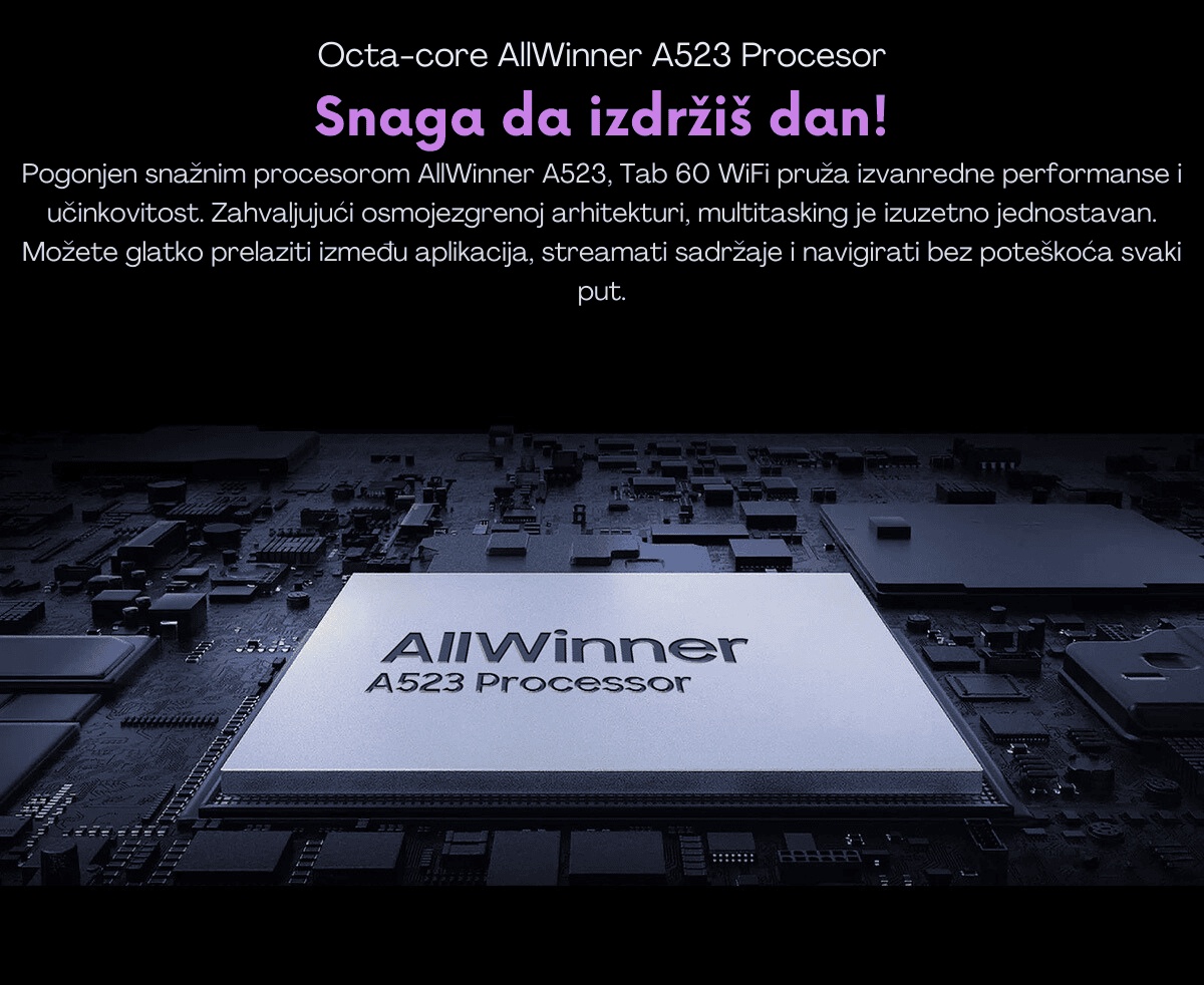 Blackview Tab 60 WiFi opremljen je snažnim osmojezgrenim AllWinner A523 procesorom, koji osigurava izvanredne performanse i energetsku učinkovitost. Ovaj procesor omogućuje glatko obavljanje više zadataka istovremeno, brzo prebacivanje između aplikacija i neometano uživanje u omiljenim sadržajima. Idealno za rad, igru i zabavu, pruža pouzdano korisničko iskustvo u svakom trenutku.