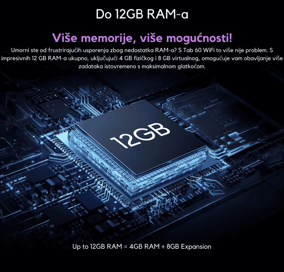 Blackview Tab 60 WiFi dolazi s impresivnih 12 GB proširivog RAM-a (4 GB fizičkog + 8 GB virtualnog), omogućujući besprijekoran multitasking i brzo izvođenje zahtjevnih zadataka. Uz 128 GB interne memorije, proširive do čak 1 TB putem TF kartice, imate dovoljno prostora za sve aplikacije, igre, fotografije i datoteke. Ovo kombinirano rješenje pruža vrhunsku brzinu i prostranost za svakodnevnu upotrebu.