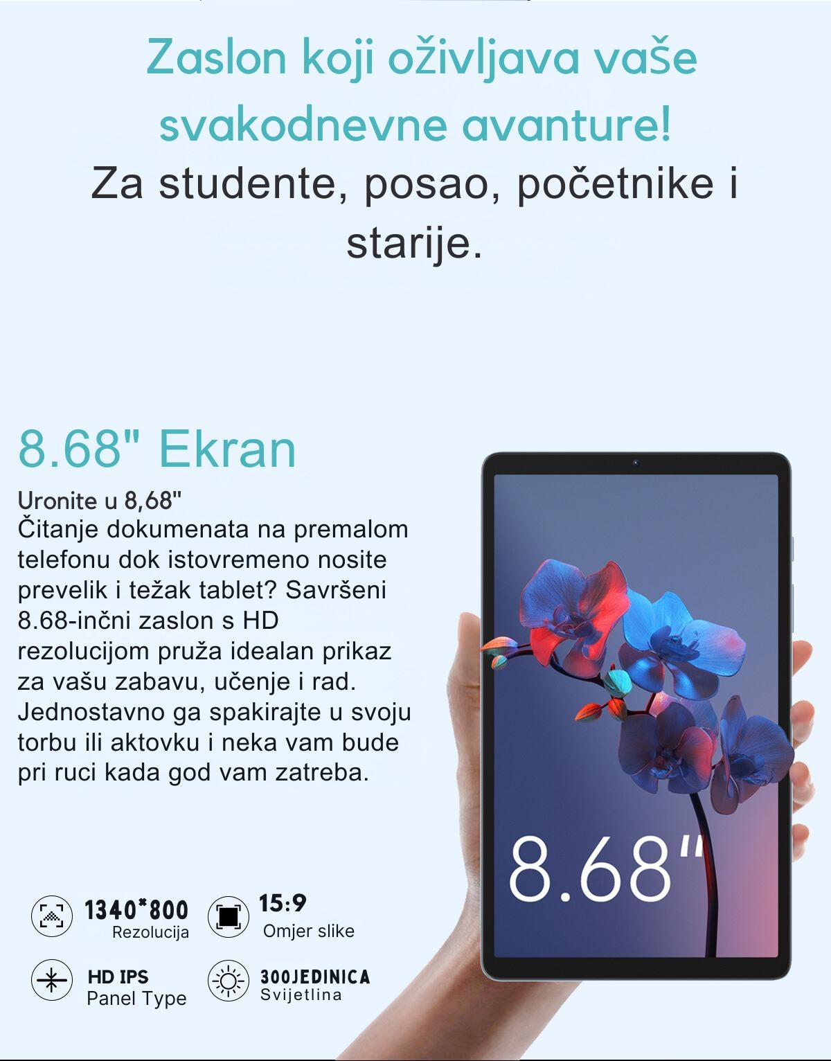 Upoznajte Blackview Tab 60, tablet koji nudi savršenu ravnotežu između funkcionalnosti i prijenosnosti! Sa svojim 8.68-inčnim HD IPS zaslonom, Tab 60 pruža izvanredan vizualni doživljaj za zabavu, učenje i rad. Kompaktan i lagan, ovaj tablet lako se uklapa u vašu torbu ili aktovku, omogućujući vam da ga nosite svuda sa sobom. Uz dugotrajnu bateriju i prilagodljive opcije za veličinu fonta, Tab 60 je idealan za sve uzraste, od djece do starijih osoba.