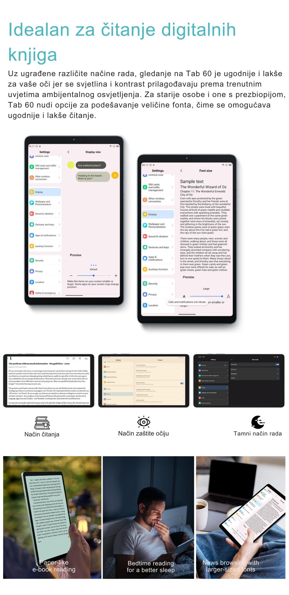 Tab 60 pruža optimalan vizualni doživljaj na 8.68-inčnom HD IPS zaslonu. Iako manjih dimenzija, ovaj tablet može sve što i veći uređaji, omogućujući vam da uživate u svojim omiljenim knjigama, bilo kada i bilo gdje. S lakoćom ga nosite u svojoj torbi ili aktovci, uvijek spreman za vaše čitalačke avanture.