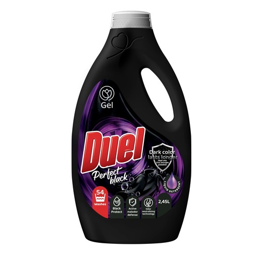 DUEL Perfect Black je tekući deterdžent za tamnu i crnu odjeću, posebno formuliran za pamučne, sintetičke i miješane tkanine, uz mogućnost strojnog i ručnog pranja.