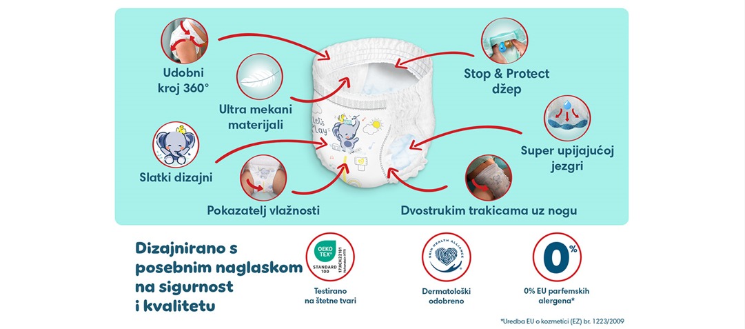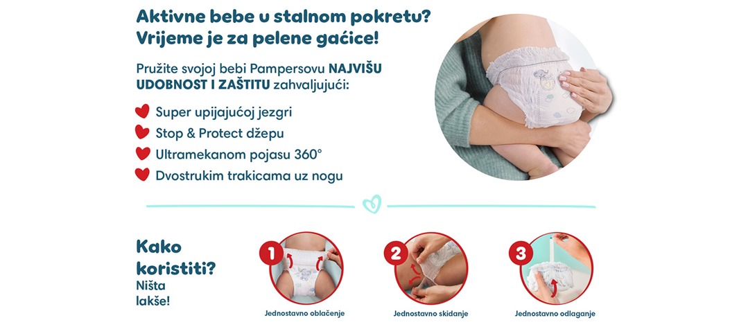 PAMPERS Pants, pelene - gaćice, veličina 6, 14-19kg, 44 kom Jednostavno mijenjanje: navucite jednim potezom Izuzetno moćna upijajuća jezgra: u t...