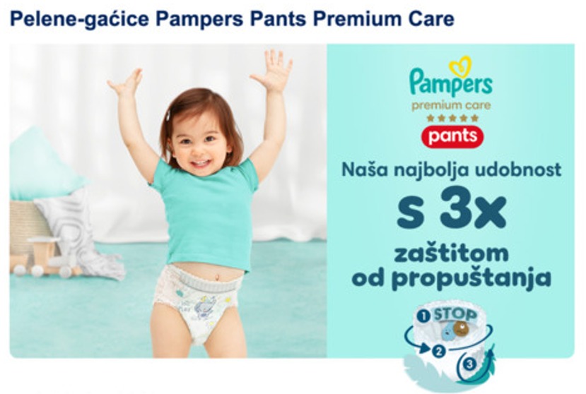 PAMPERS Premium Care Pants, pelene - gaćice, veličina 4, 9-15kg, 38 kom Mekane poput paperja i prozračne za maksimalnu udobnost Lako oblačenje i...