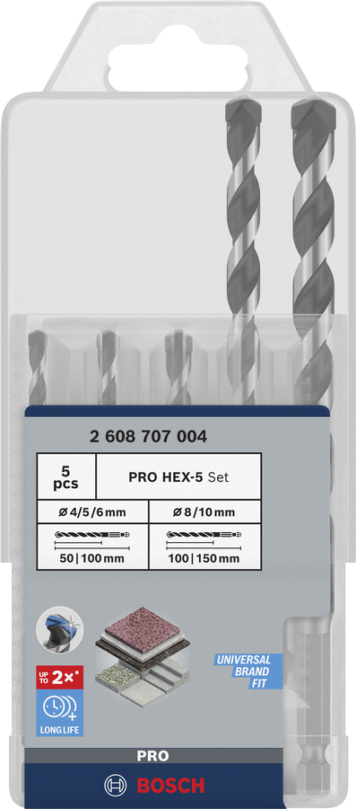 Standardna udarna i rotacijska svrdla brzo se troše. S druge strane, upotreba udarnih bušilica sa svrdlima za bušaći čekić može rezultirati netočnim provrtima s iverjem i slomljenim kamenim pločama. Izradili smo PRO HEX-5 kako bismo donijeli rješenje. Svrdlo ima poseban dizajn vrha kako biste bili sigurni da možete izbušiti čiste provrte udarnom bušilicom – pri svakoj upotrebi.