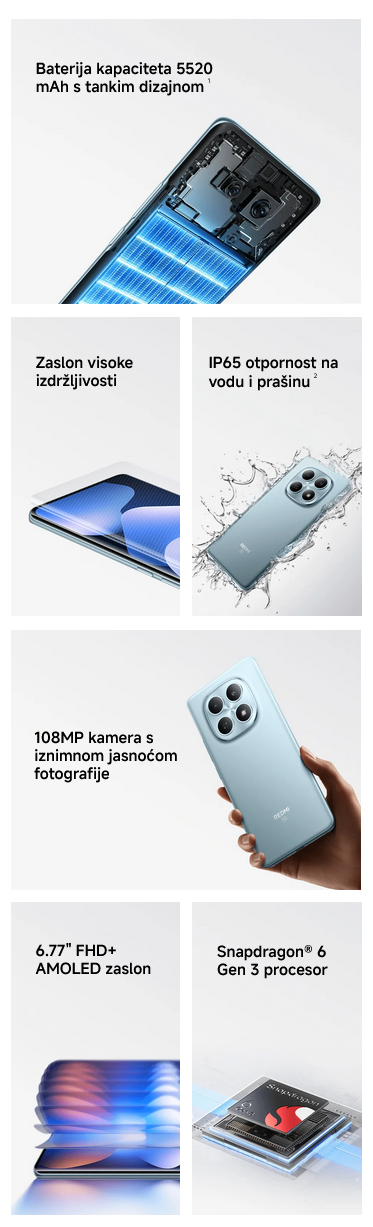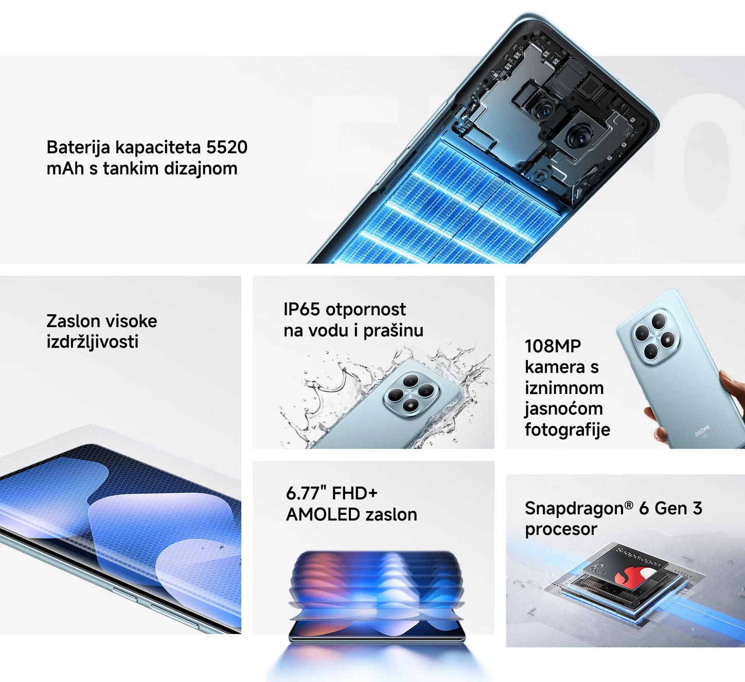 6,77" AMOLED zaslon 120 Hz, 3200 nita Snapdragon 6 Gen 3 (4 nm) Glavna kamera 108 MP s OIS ...