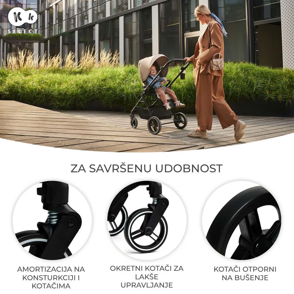 Iznimno su okretna i vrlo laka za upravljanje. Bebu ćete na samom početku prevoziti u udobnoj, dubokoj košari s mekanim madracem i velikim vodootpornim krovićem s UPF50+ filtrom, s kojeg se materijal može skinuti kako bi beba imala panoramski pogled dok leži na trbuhu.