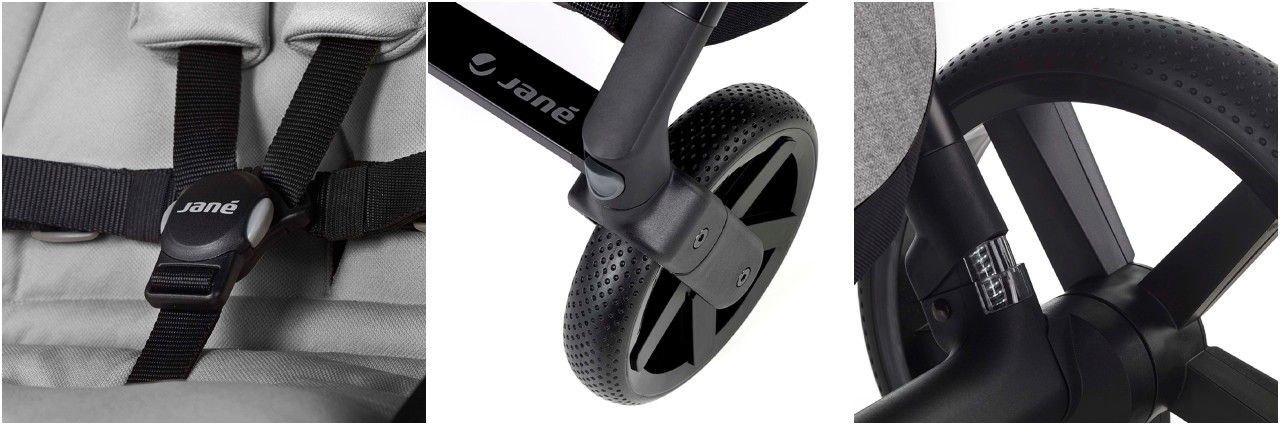 Autosjedalica Koos iSize R1 osigurava visoku razinu sigurnosti, udobnosti i praktičnosti za novorođenčad. Opremljena je bočnom zaštitom koja učinkovito apsorbira udarce sa strane, čime se povećava sigurnost djeteta u slučaju prometne nesreće. Jednostavno se pričvršćuje na Jané kolica zahvaljujući Pro-Fix sustavu, bez potrebe za dodatnim adapterima. Ugrađeni 5-točkovni sigurnosni pojas ravnomjerno raspoređuje sile pri sudaru, osiguravajući čvrsto i sigurno zadržavanje djeteta u sjedalici. Krović sjedalice izrađen je od prozračnog, vodootpornog materijala, pruža zaštitu od vjetra i posjeduje UPF 50+ zaštitu od štetnog sunčevog zračenja. Autosjedalica se može postaviti u automobil samostalno pomoću sigurnosnog pojasa ili uz pomoć ISOFIX baze iPlatform Comfy s potpornom nogom (baza nije uključena u paket). Naslon za glavu može se podešavati u pet položaja, čak i dok dijete sjedi, čime se omogućuje savršeno prilagođavanje veličini i udobnosti. Osim toga, autosjedalica uključuje umetak (40–60 cm), koji pruža dodatnu potporu i sigurnost najmlađima.