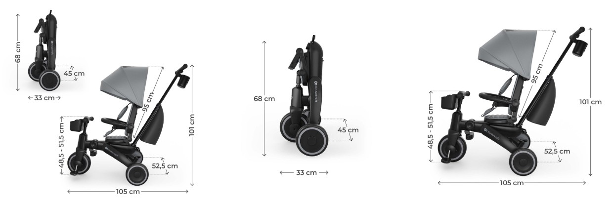 Udobnost djeteta osigurava podesivi naslon s poluležećim položajem, koji je moguće okrenuti u oba smjera vožnje, zajedno s podesivim osloncima za noge – savršeno za drijemanje tijekom šetnje. Za siguran prijelaz prema samostalnosti tu su free steering i free wheel funkcije, koje omogućuju djetetu vježbanje pedaliranja i skretanja dok roditelj zadržava kontrolu pomoću teleskopske ručke.