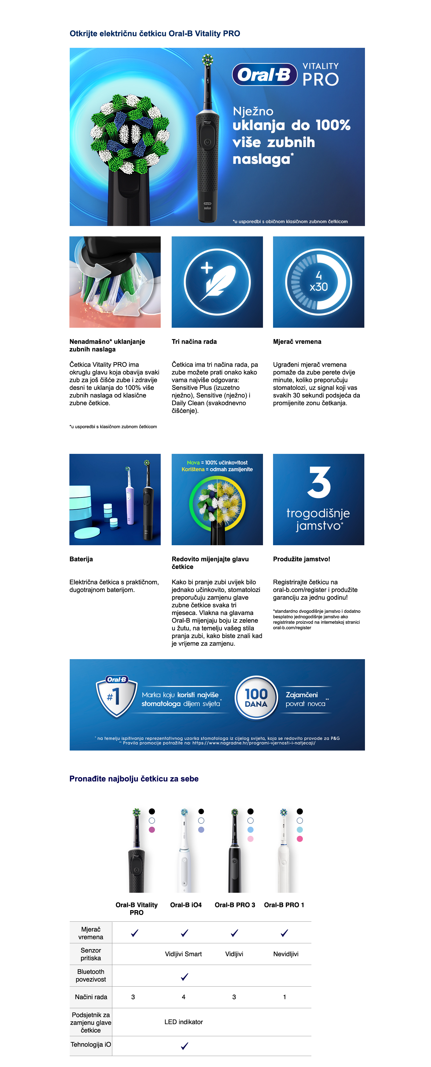 Električna zubna četkica Oral-B Pro pruža klinički dokazano vrhunsko čišćenje u usporedbi s običnom klasičnom zubnom četkicom. Četkica ima 3 načina rada: Daily Clean (svakodnevno čišćenje), Sensitive (nježno) i Sensitive Plus (iznimno nježno) za nevjerojatno nježno iskustvo. Mjerač vremena ugrađen u dršku pomaže da pranje zuba traje 2 minute, u skladu s preporukama stomatologa. I što je najbolje – sve to omogućuje Oral-B, marka zubnih četkica br. 1 koju upotrebljava najviše stomatologa diljem svijeta.