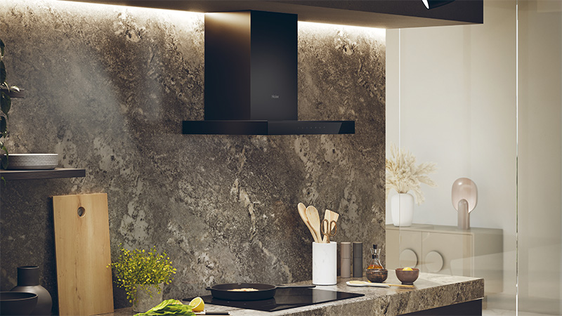Elegantna Haier napa s perimetralnim usisavanjem učinkovito eliminira neželjene mirise i dim, osiguravajući svjež i čist zrak u vašoj kuhinji.