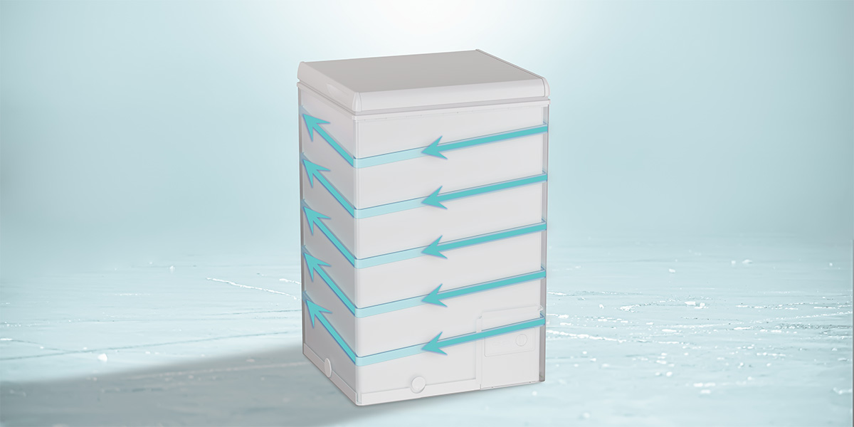Uživajte u bržem i ravnomjernijem hlađenju s novom tehnologijom Freeze Circle Fresh! Zahvaljujući jedinstvenom protoku rashladnog plina odozdo prema gore, proces zamrzavanja je brži, a potrošnja energije manja.