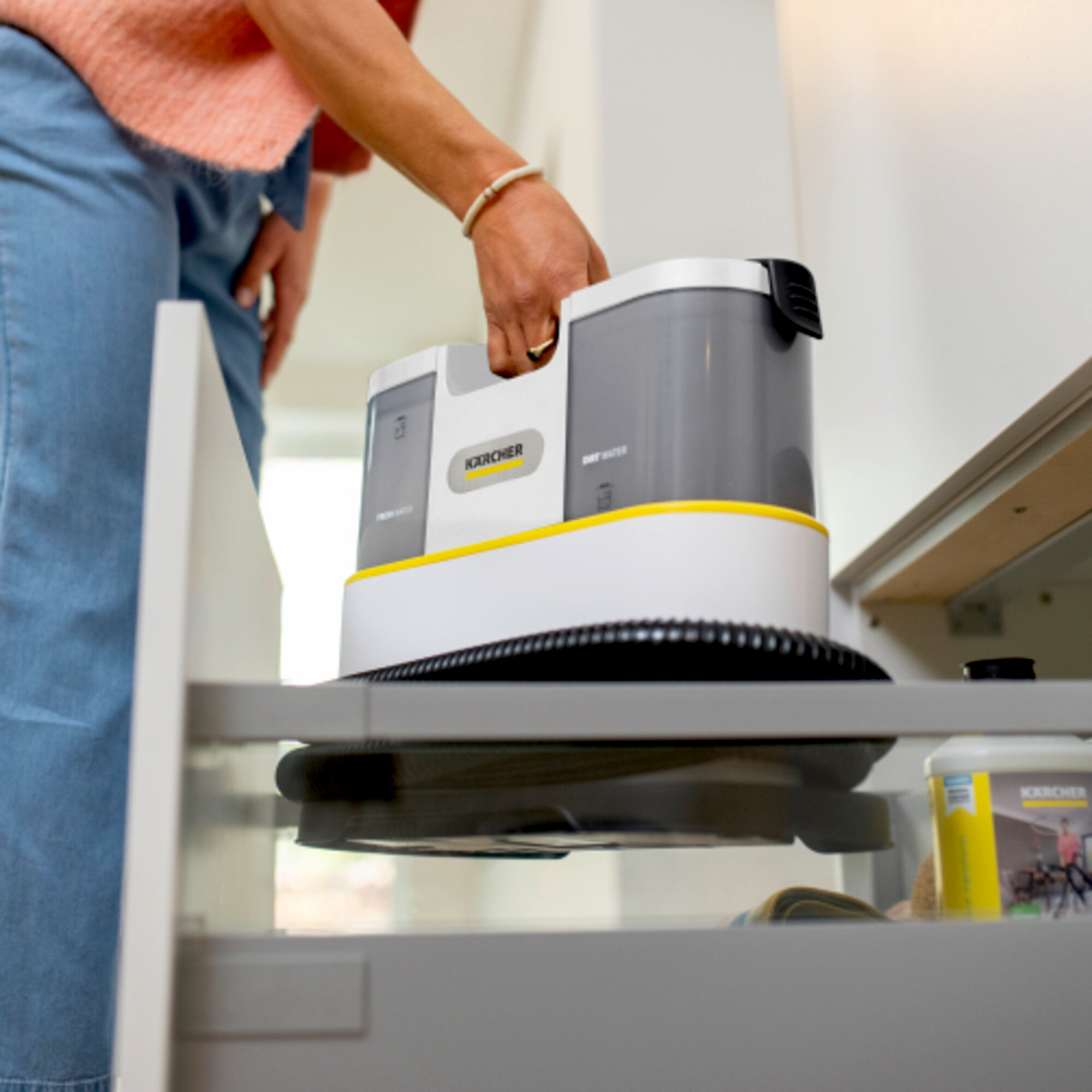 Praktični čistač tekstila SE 2 Spot Pure savršen je pomoćnik za ciljano i trenutačno uklanjanje mrlja s presvlaka i tekstila. SE 2 Spot Pure učinkovito uklanja prljavštinu i neugodne mirise te se uspješno nosi, primjerice, s mrljama od hrane i pića. Zahvaljujući kompaktnom dizajnu, uređaj je posebno jednostavan za korištenje i zauzima malo prostora pri pohrani. To znači da je uvijek brzo spreman za rad kada se pojavi neočekivana prljavština. Veliki radni radijus, omogućen kabelom duljine 4,5 metra, pruža fleksibilno čišćenje u cijeloj prostoriji. Praktično pohranjivanje pribora na uređaju omogućuje da su svi nastavci brzo pri ruci i spremni za uporabu. U kompletu se nalaze nastavak za pranje presvlaka i sredstvo za čišćenje.