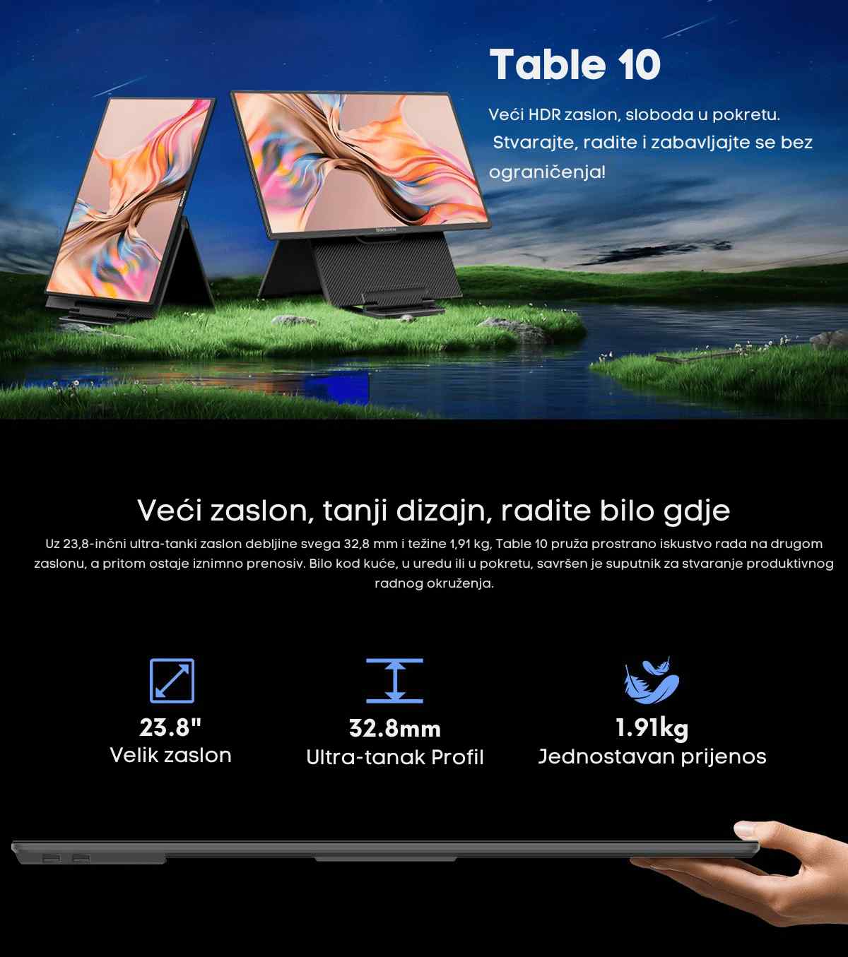 Blackview Table 10 prijenosni monitor osmišljen je za korisnike koji traže fleksibilnost bez kompromisa u kvaliteti prikaza. Bilo da radite od kuće, putujete ili jednostavno trebate dodatni zaslon, Table 10 nudi tanko, moderno i lagano rješenje koje se uklapa u svako radno ili kreativno okruženje.