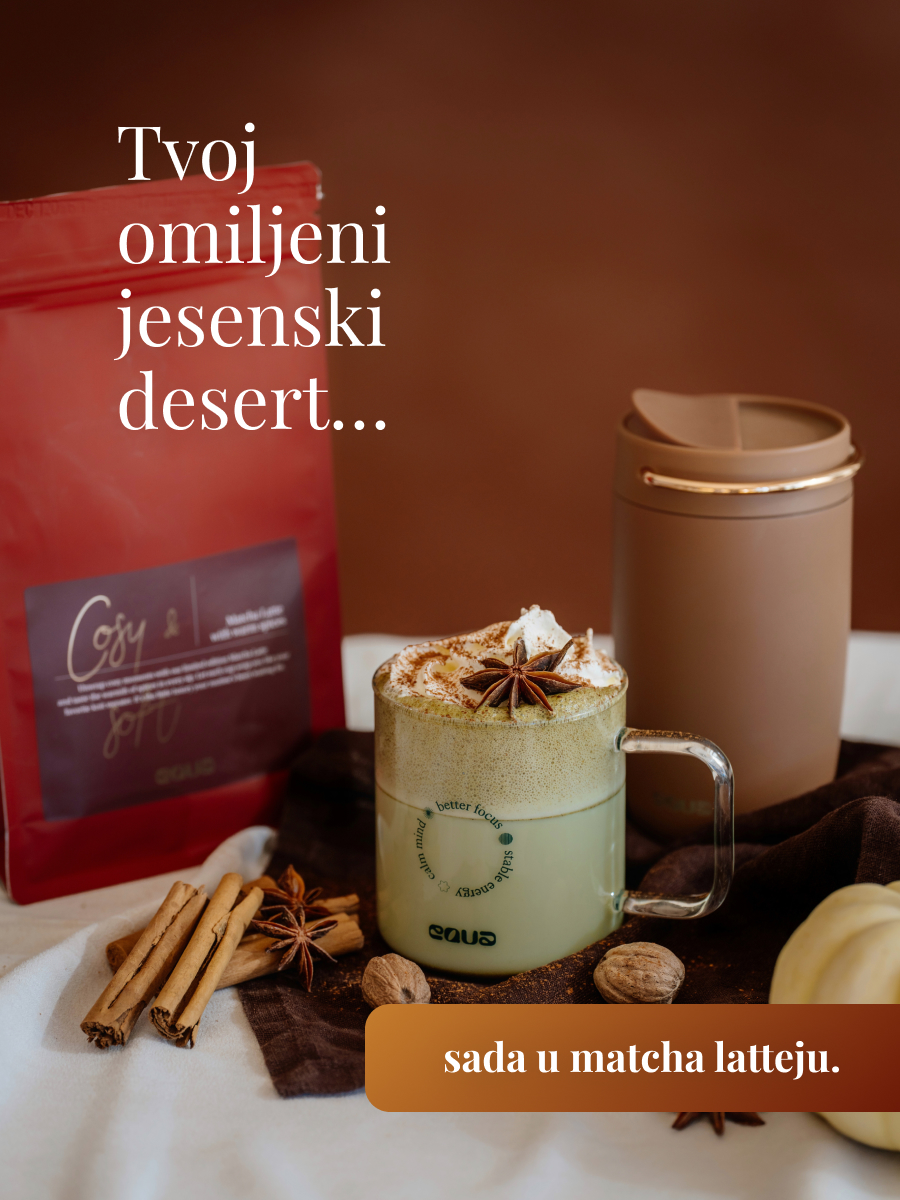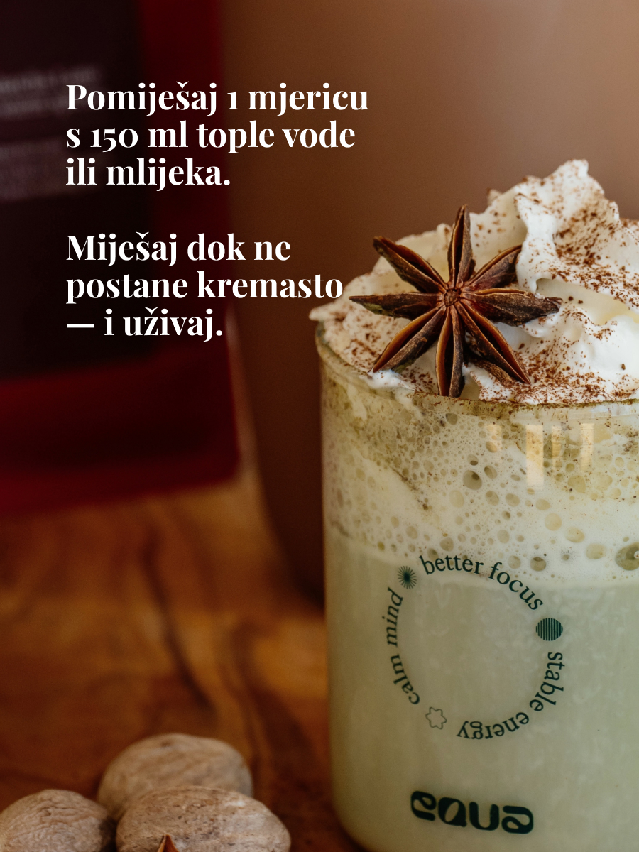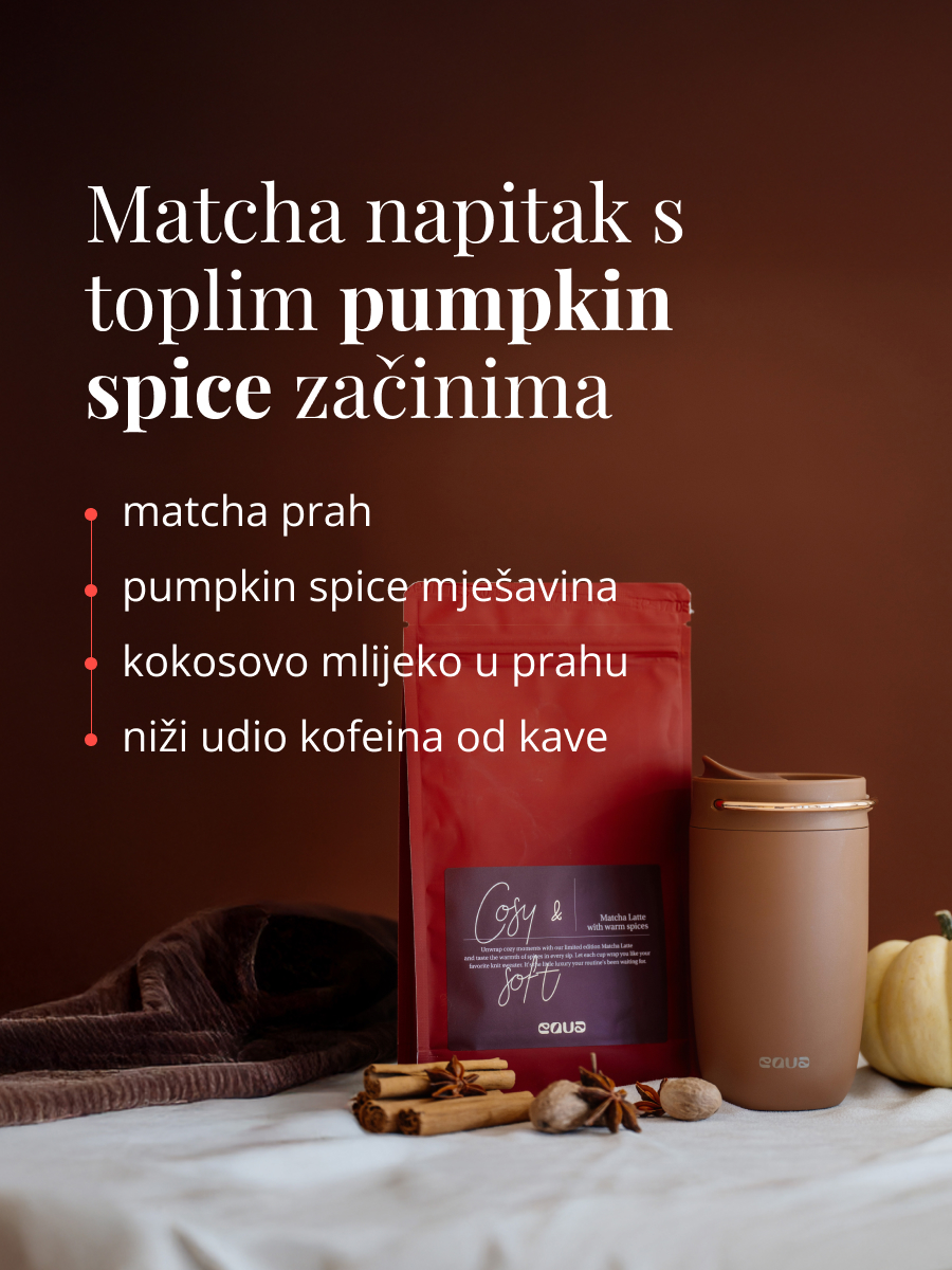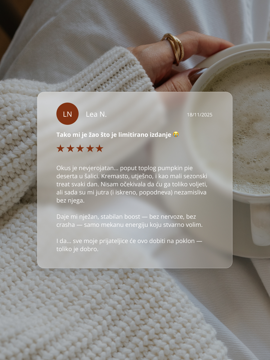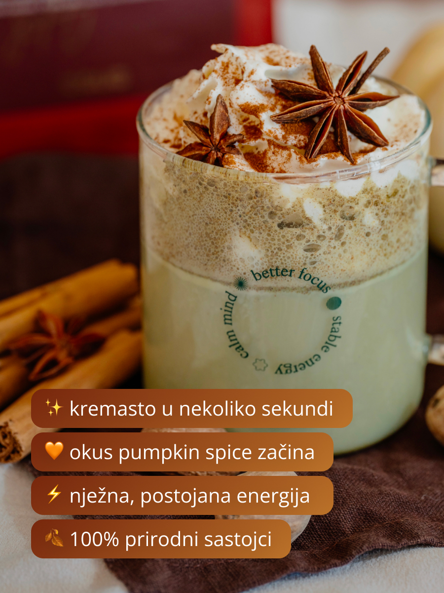 Matcha s prirodnim L-teaninom pomaže ti da ostaneš mirna i fokusirana, dok tople note pumpkin spicea stvaraju pravi blagdanski ugođaj.